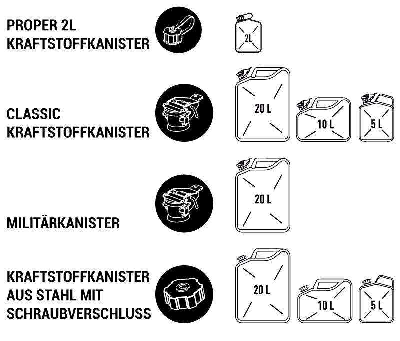 Wir bieten Metall-Kraftstoffkanister in den Größen 2 l, 5 l, 10 l und 20 l an. Sie haben die Wahl zwischen einem Schraubverschluss mit integriertem Magneten oder dem klassischen Bajonettverschluss, die beide einen sicheren Verschluss gegen Auslaufen und Dampfemissionen gewährleisten.