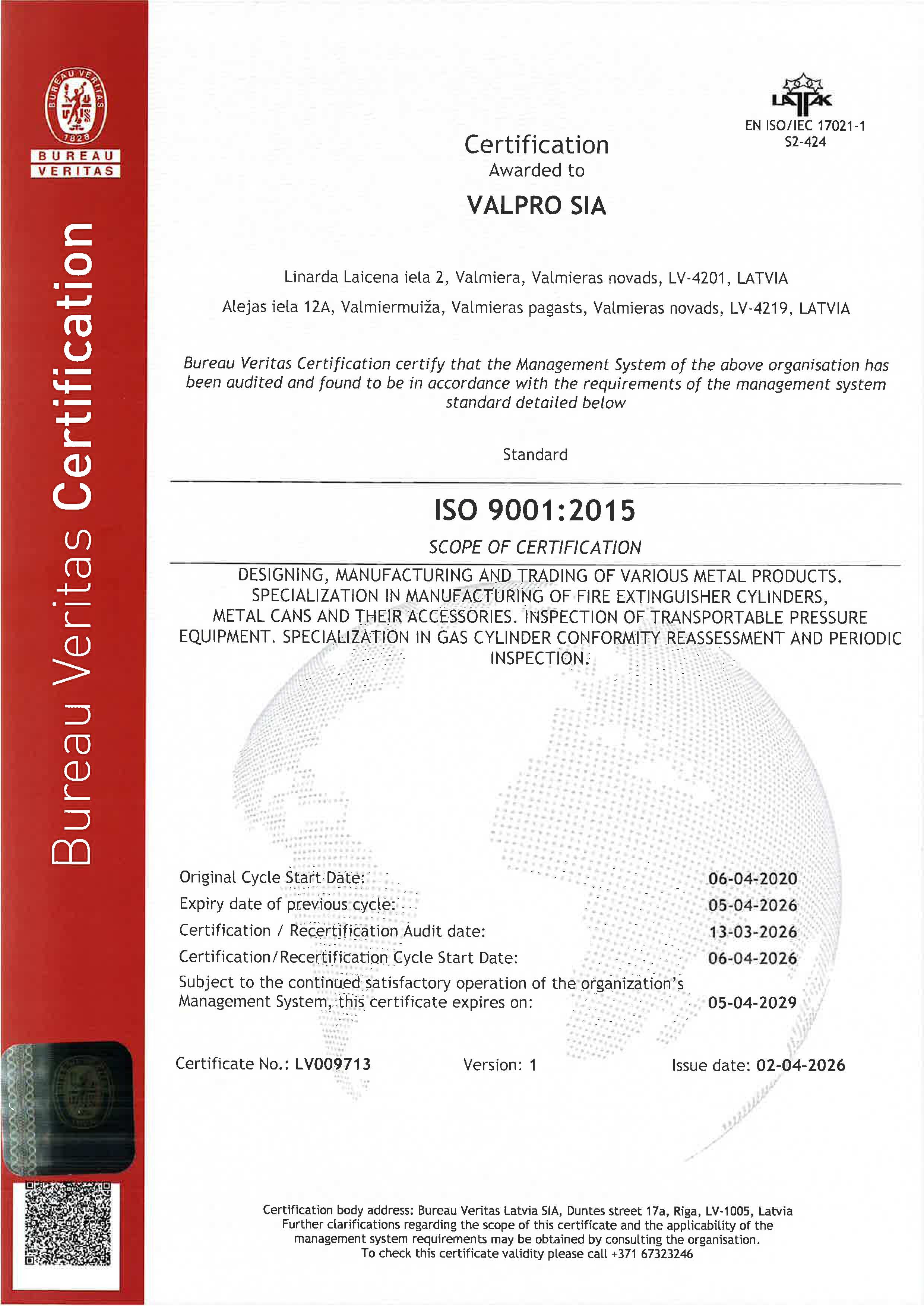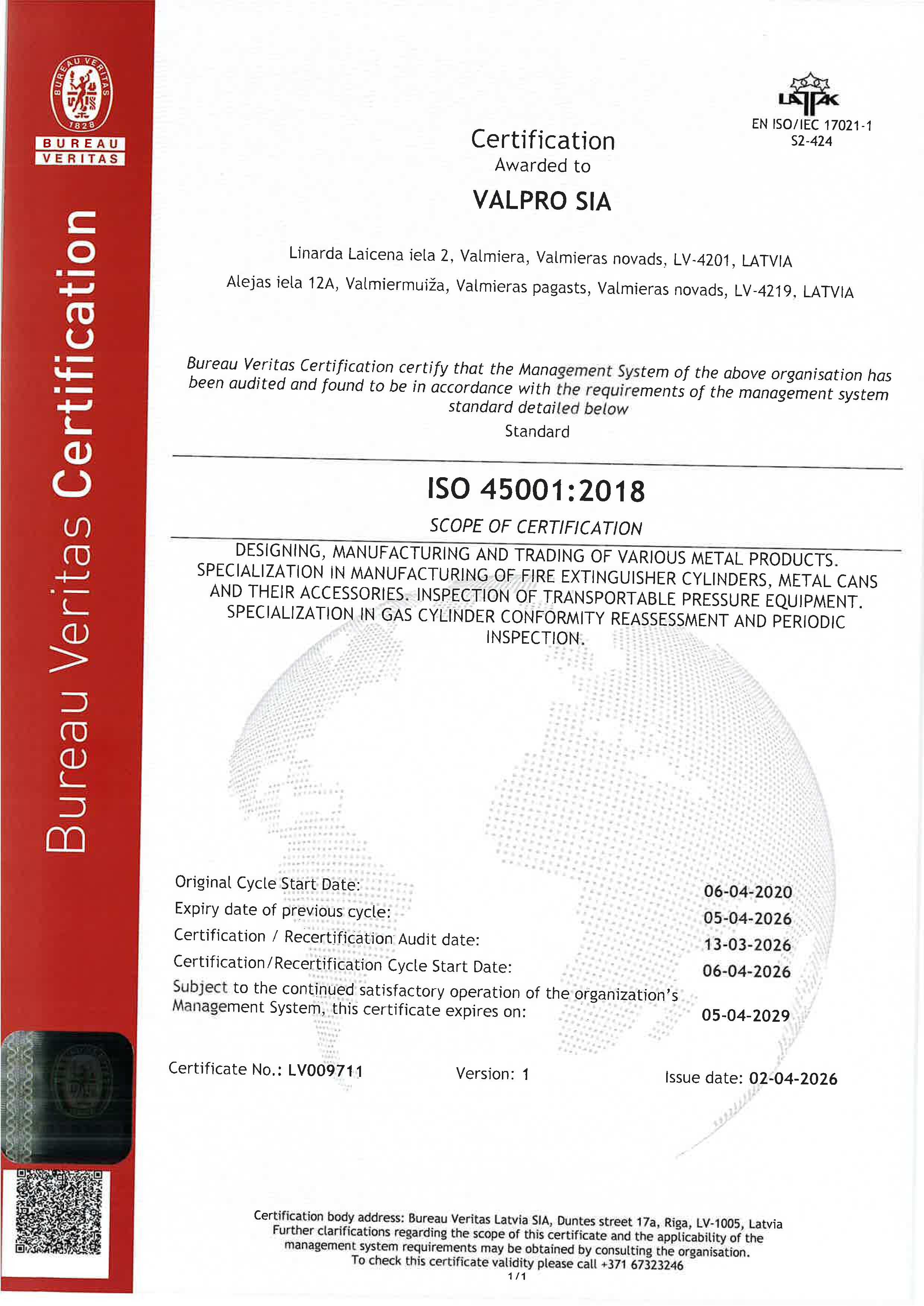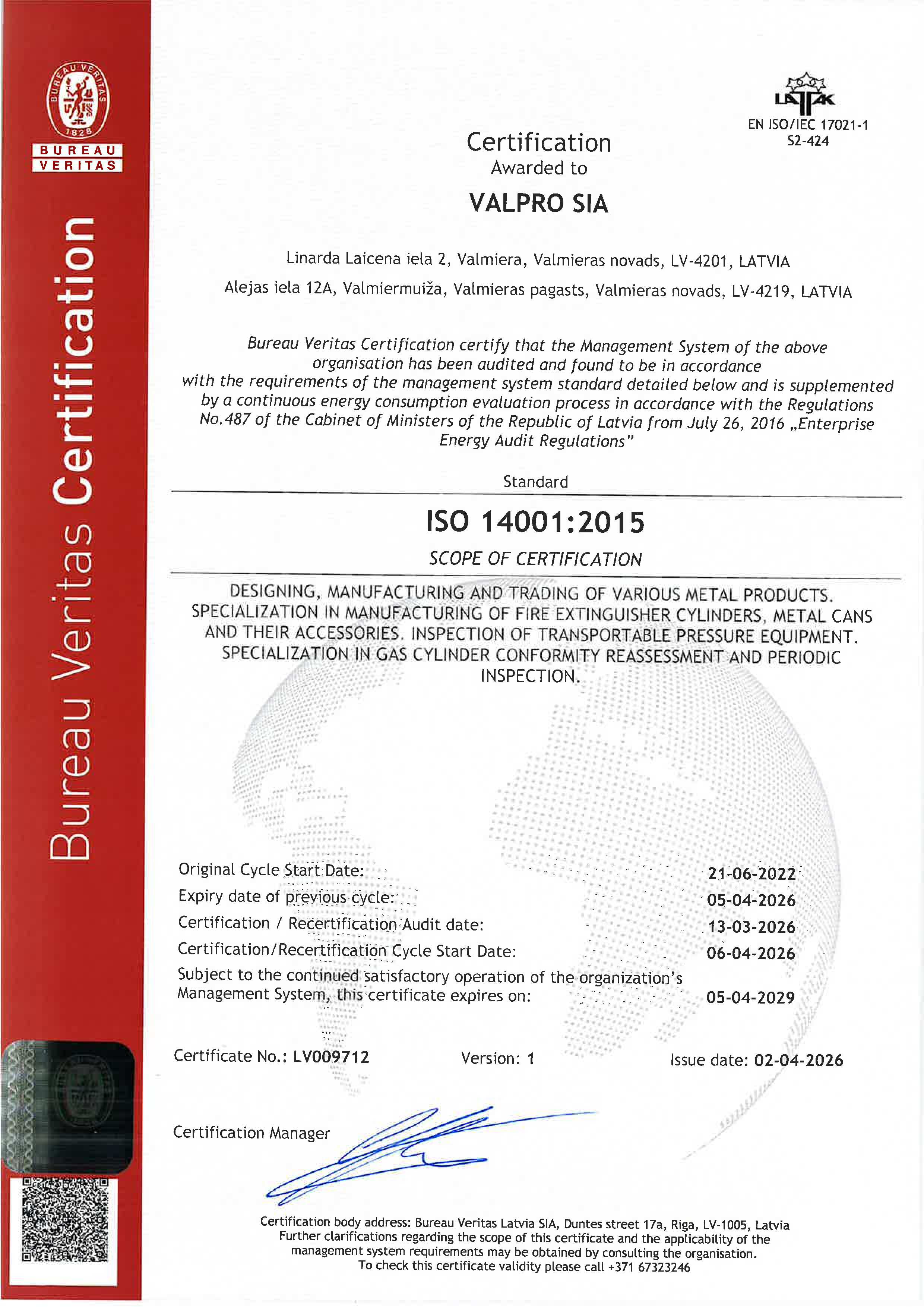 VALPRO has reauthorized Integrated Quality, Evironmental, Energy and Safety Managment System according to the requirements of Standards ISO 9001:2015, ISO 14001:2015 completed with a continuous energy consumption evaluation process in accordance with the Regulations No.487 of the Cabinet of Ministers of Republic of Latvia from July 26, 2016 "Enterprise Energy Audit Regulations" and ISO 45001:2018