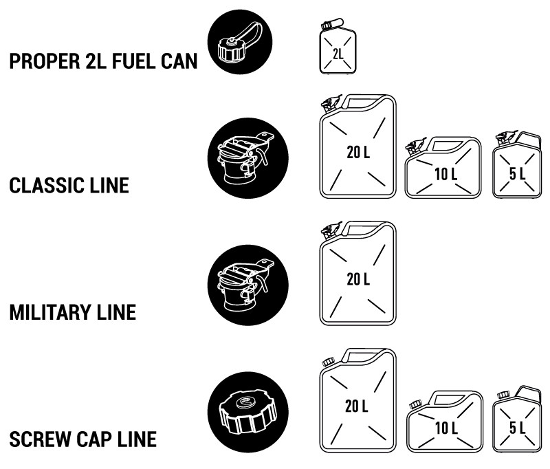 There are available 2L, 5L, 10L and 20L metal fuel cans with a choice between a screw cap with an integrated magnet or the classic bayonet-type cap, which ensures a secure seal against leaks and vapor emissions.