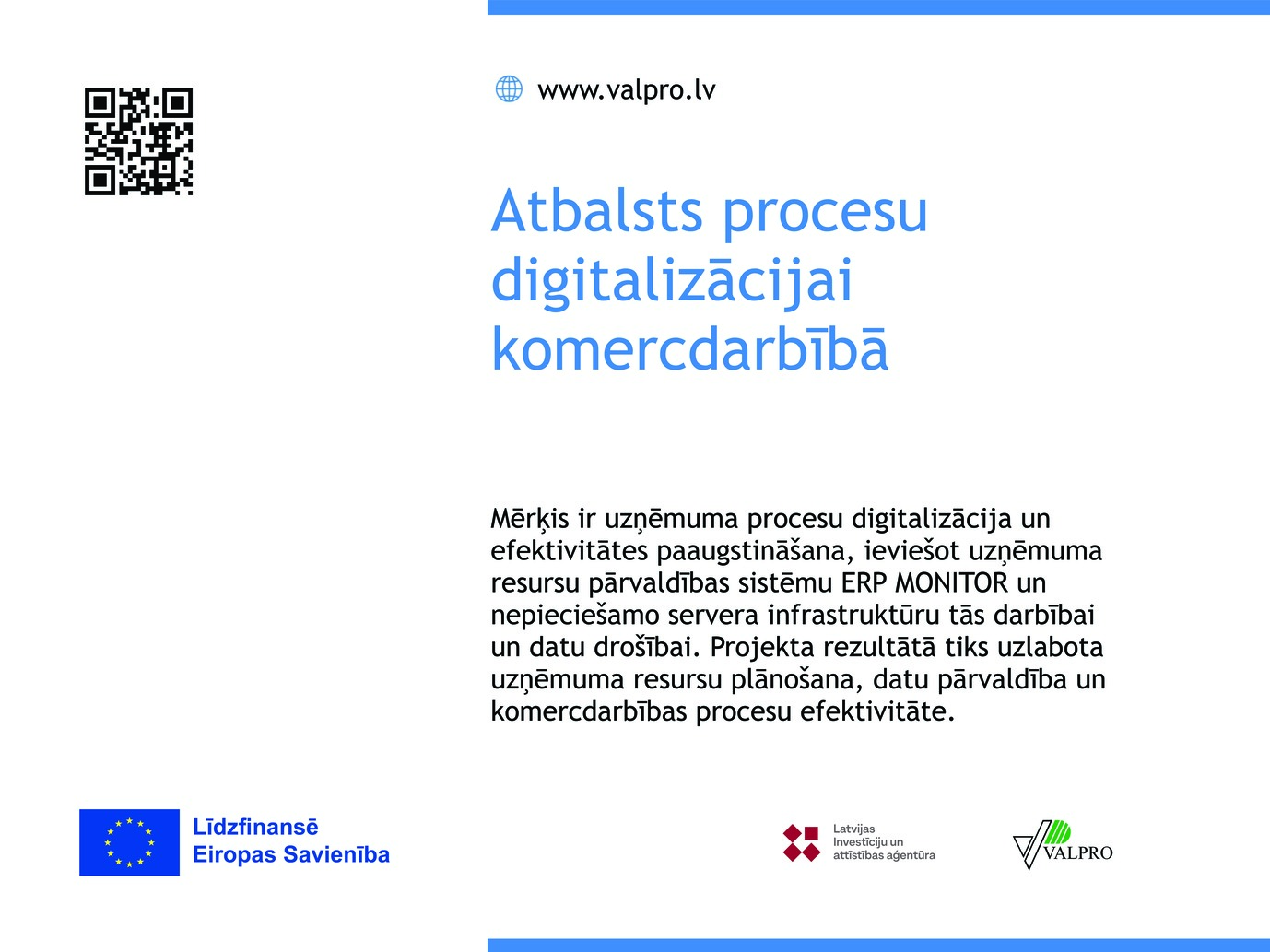 Mērķis ir uzņēmuma procesu digitalizācija un efektivitātes paaugstināšana, ieviešot uzņēmuma resursu pārvaldības sistēmu ERP MONITOR un nepieciešamo servera infrastruktūru tās darbībai un datu drošībai. Projekta rezultātā tiks uzlabota uzņēmuma resursu plānošana, datu pārvaldība un komercdarbības procesu efektivitāte.